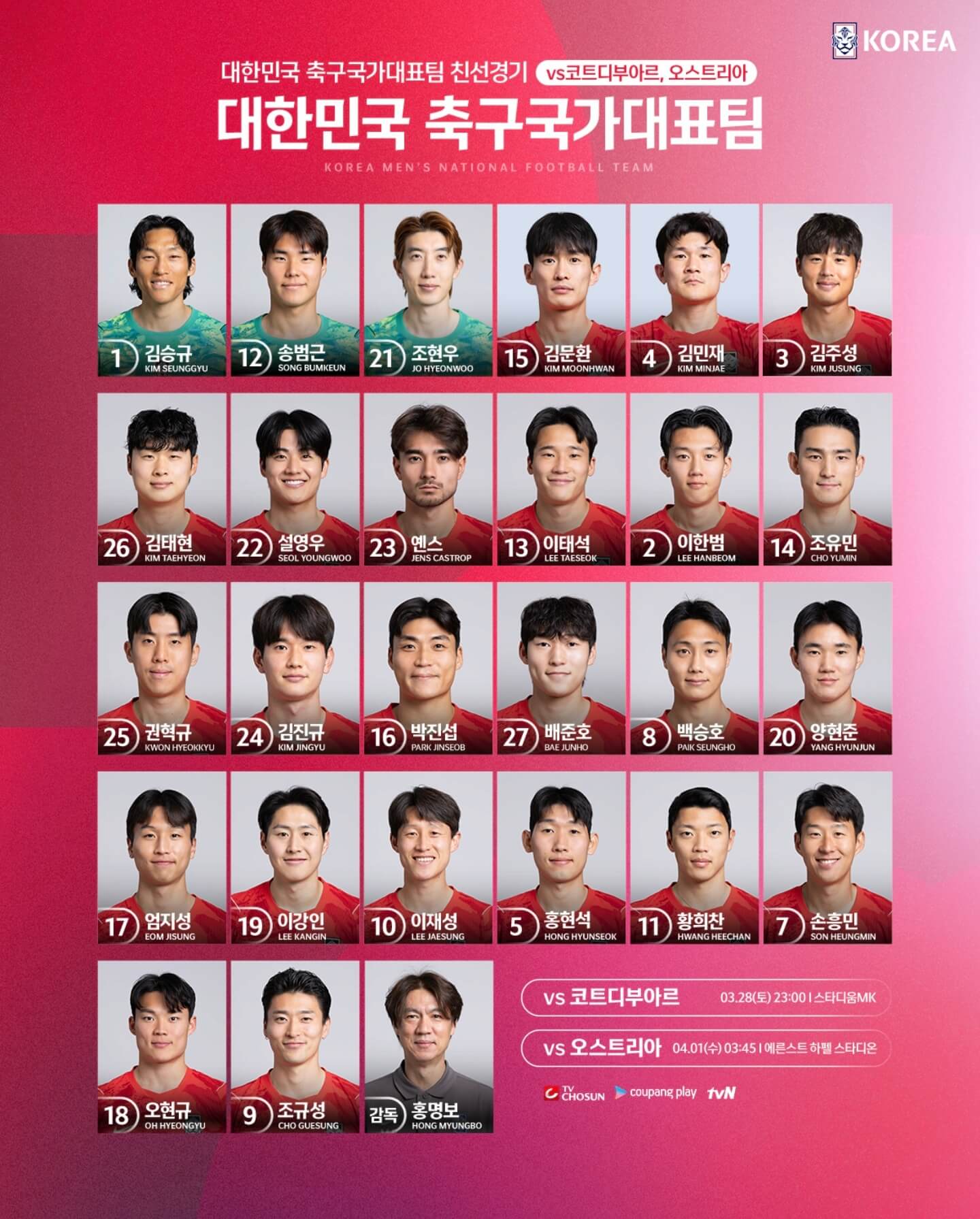 홍명보 감독이 이끄는 대한민국 축구 국가대표팀의 3월 유럽 원정 2연전이 오늘 밤 시작됩니다. 코트디부아르와 오스트리아를 상대하는 이번 일정은 최정예 멤버로 꾸려졌는데요~ 팬들의 원활한 시청을 돕기 위해 국가대표 축구 중계방송 생중계 시간 정보와 확정된 선수들의 배번호 명단을 핵심만 간결하게 정리해보겠습니다.