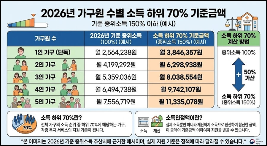 국가의 복지 혜택은 매년 보건복지부가 발표하는 기준 중위소득을 바탕으로 결정됩니다. 일반적으로 소득 하위 70% 기준금액 수치는 기준 중위소득의 150% 수준과 맞닿아 있는데요~ 2026년에는 이 중위소득이 역대 최대 수준인 6.51퍼센트 인상됨에 따라 전체적인 커트라인도 함께 상승했습니다. 무엇보다 자신에게 맞는 정확한 확인방법 정보를 통해 혜택 대상 여부를 점검하는 것이 유리합니다.