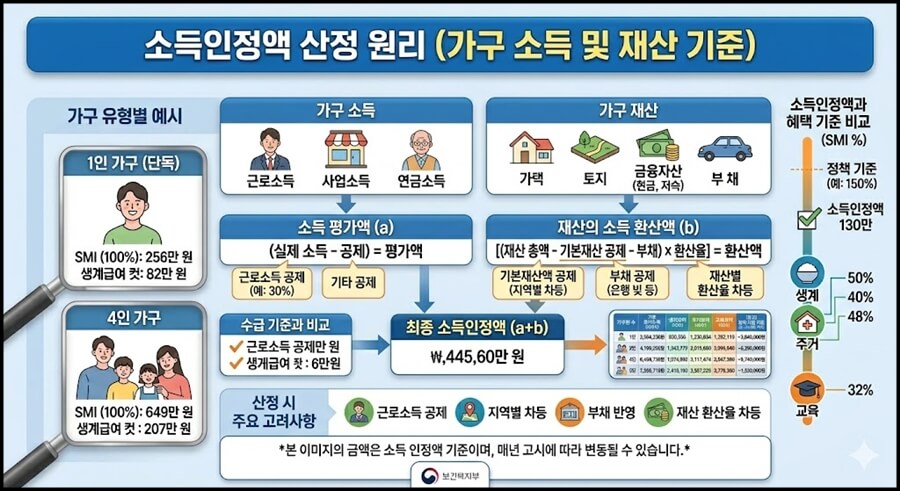 올해 기준 중위소득 인상분이 반영되어 4인 가구 기준 월 소득인정액 974만 원 이하가 해당 구간에 속합니다.